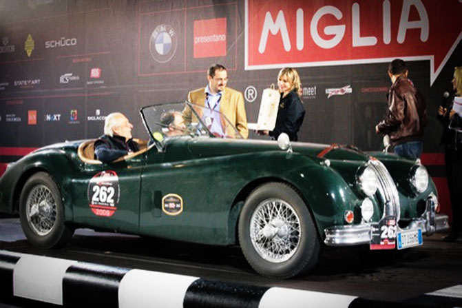jaguar XK 140 OTS Roberto Menegatto e Francesco Lotti all'arrivo della Mille Miglia
